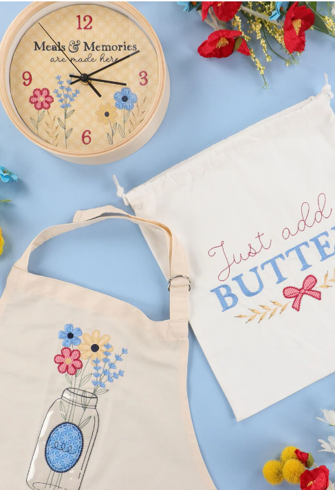 At Kimberbell’s one-day machine embroidery event, you’ll make three functional projects with a cottagecore feel: the Meals & Memories Clock, the Just Add Butter Cinch Sack, and a Mason Jar Bouquet Gathering Apron with roomy pockets! With a variety of fresh techniques, Just Add Butter is your recipe for fun.