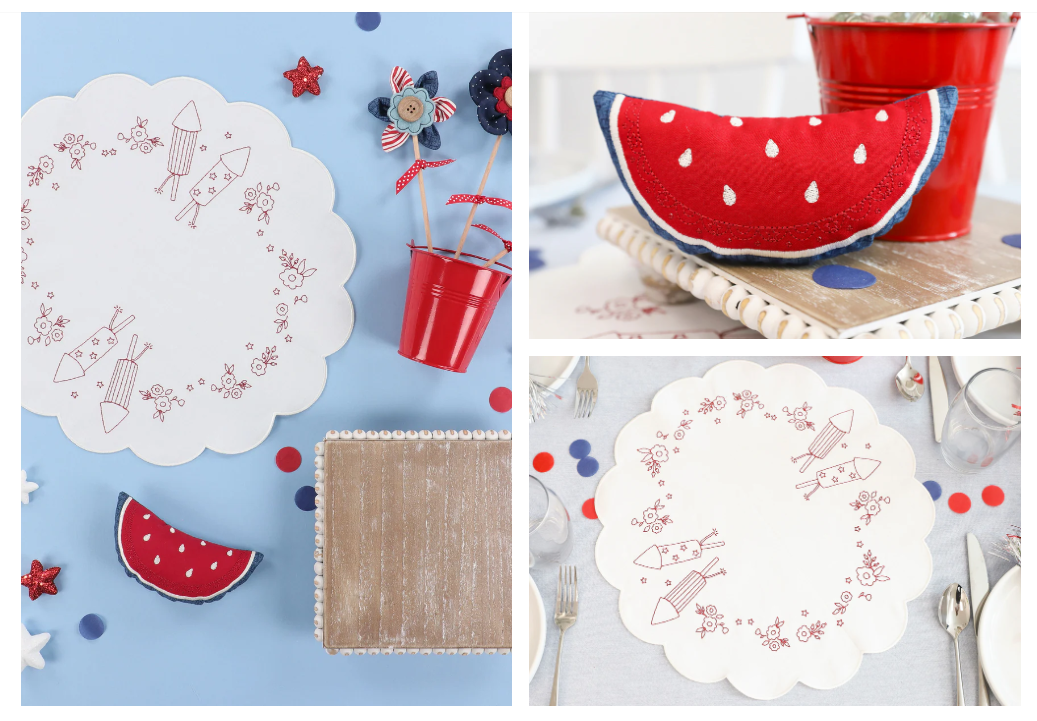 Redwork Table Round • Patriotic Posy • Starry Blossom 1 • Starry Blossom 2 • Summer Slice Stuffie